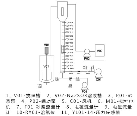 攪拌槽、Na2SO3溶液槽、砂漿泵、蠕動(dòng)泵、風(fēng)機、攪拌電機、砂漿流量計、電磁流量計、電磁流量計、溶氧儀、電導率儀、閥門(mén)管件、空氣開(kāi)關(guān)等電氣、嵌入式一體化彩色觸控顯示屏。