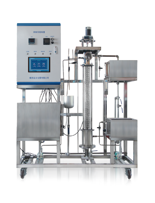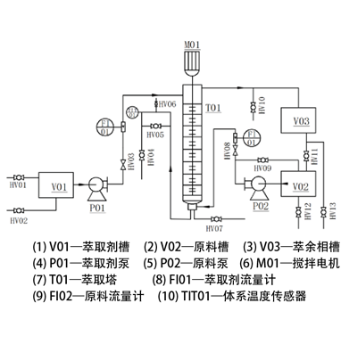 轉盤(pán)萃取塔、調速電機、萃取劑槽、原料槽、萃余相槽、原料泵、萃取劑泵、轉子流量計、溫度傳感器、不銹鋼閥門(mén)若干、智能儀表、嵌入式一體化彩色觸控顯示屏。