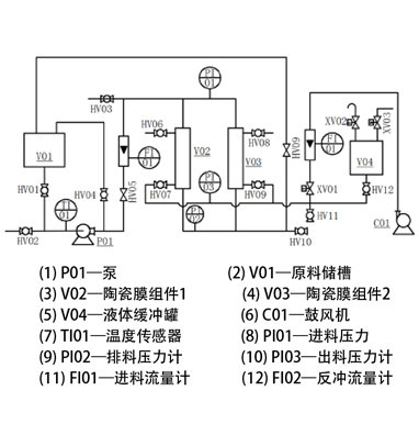 原料罐、原料泵、轉子流量計、陶瓷膜組件、緩沖罐、電磁閥、智能儀表、嵌入式一體化彩色觸控顯示屏。