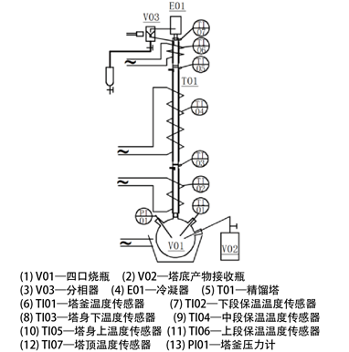 精餾塔、回流比控制器、溫度檢測器、溫度控制器、電加熱器、填料、餾出液收集器、電磁繼電器、蛇形冷凝管、球形冷凝管、回流罐、分液漏斗、智能儀表、嵌入式一體化彩色觸控顯示屏。