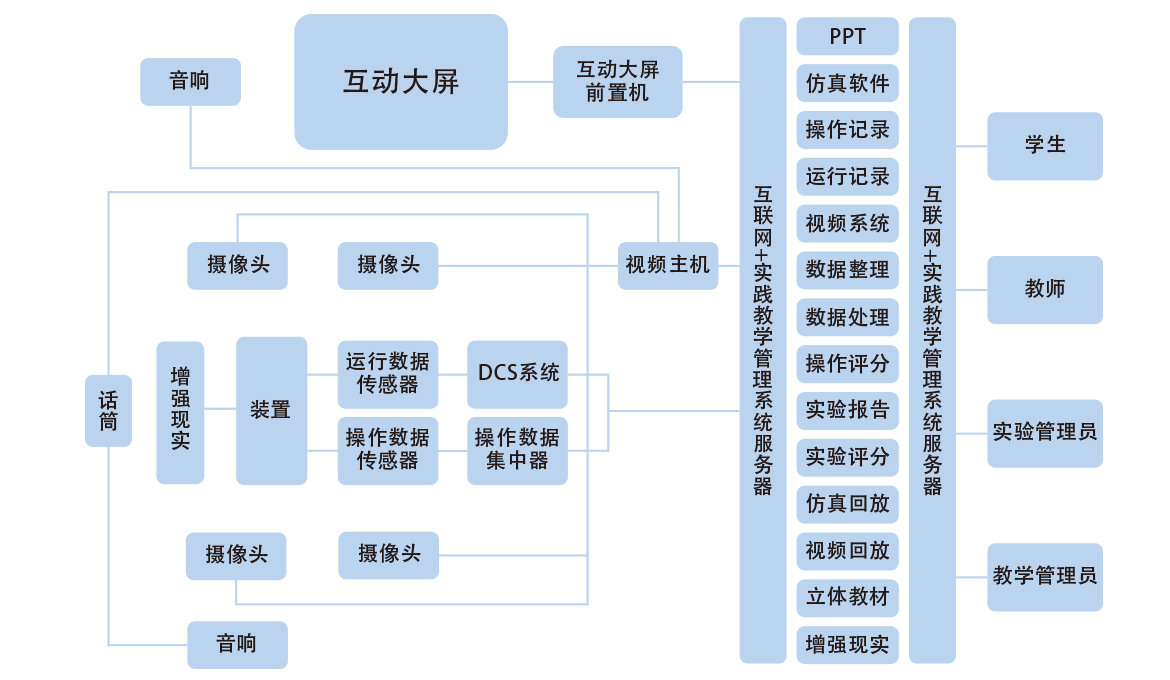 互聯(lián)網(wǎng)+實(shí)踐教學(xué)管理系統服務(wù)器集成了虛擬現實(shí)仿真系統、操作記錄系統、運行記錄系統、圖像記錄系統、立體教材系統、增強現實(shí)系統,能夠展示PPT、數據整理、數據處理、操作評分、生成實(shí)驗報告、進(jìn)行仿真回放、視頻回放。