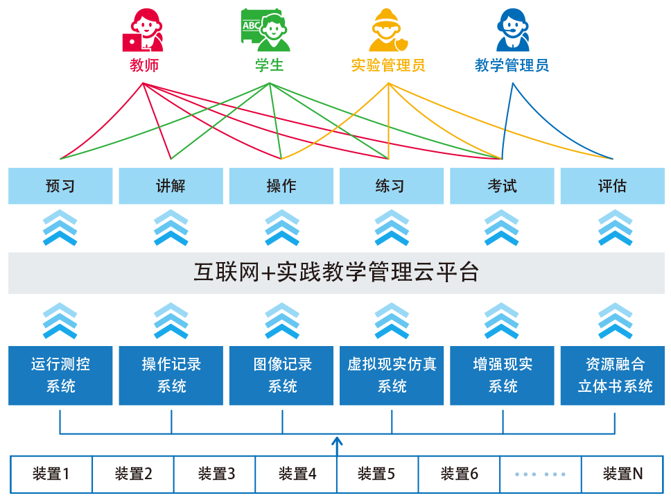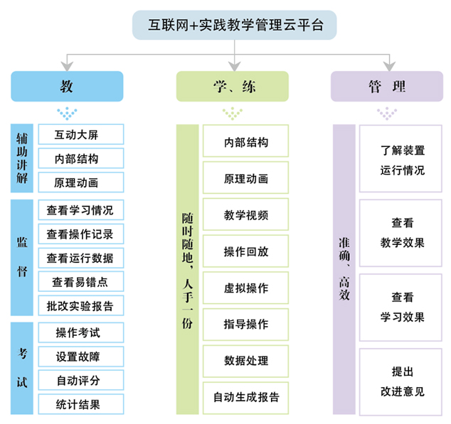 互聯(lián)網(wǎng)+實(shí)踐教學(xué)管理系統由互聯(lián)網(wǎng)+實(shí)踐教學(xué)管理云平臺、操作記錄系統、運行測控系統、圖像記錄系統、立體教材系統、虛擬現實(shí)仿真系統、增強現實(shí)系統等與傳統的實(shí)踐教學(xué)裝置有效整合在一起,為教師和學(xué)生提供一體化的實(shí)踐教學(xué)方案。